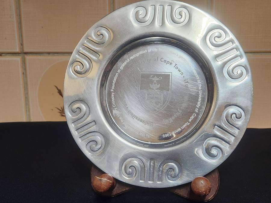 CARROL BOYES PLATE WITH THE UCT COAT OF ARMS DEPICTED IN THE CENTRE. IT IS IN A WELL-PRESERVED CONDITION AND MEASURES 26.5 CM IN DIAMETER.