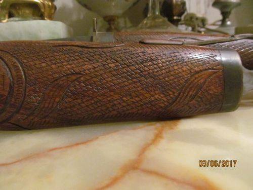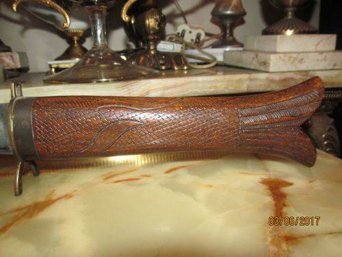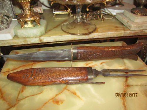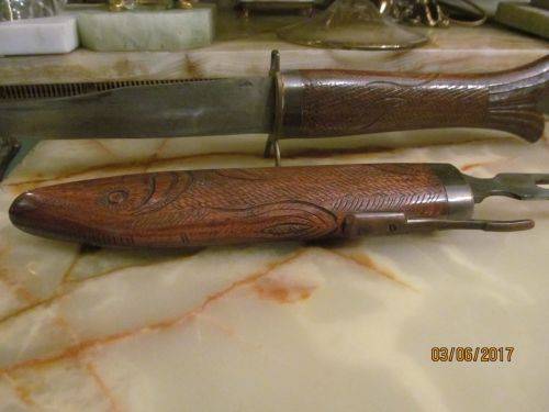 VINTAGE HAND CARVED SET -- MEAT CARVING SET KNIFE & FORK WITHIN FISH CASE