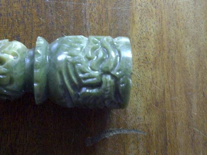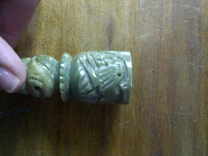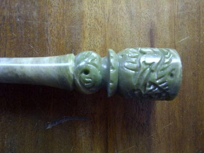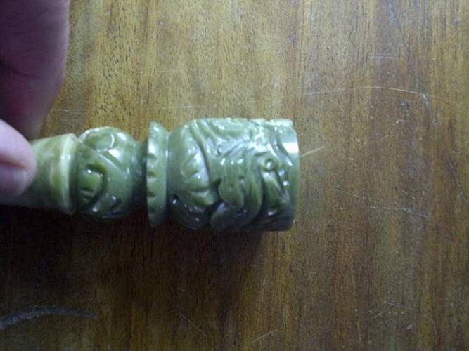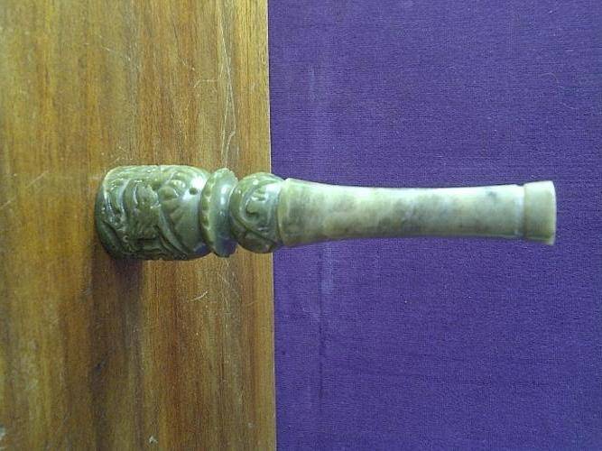 A solid alabaster pipe - presumably oriental - carved with images of a lion chasing a deer. The pipe is in good condition, it does have a small chip and some wear on the mouth, but very minimal. A lovely addition to your pipe collection. The pipe measures 12.2cm long