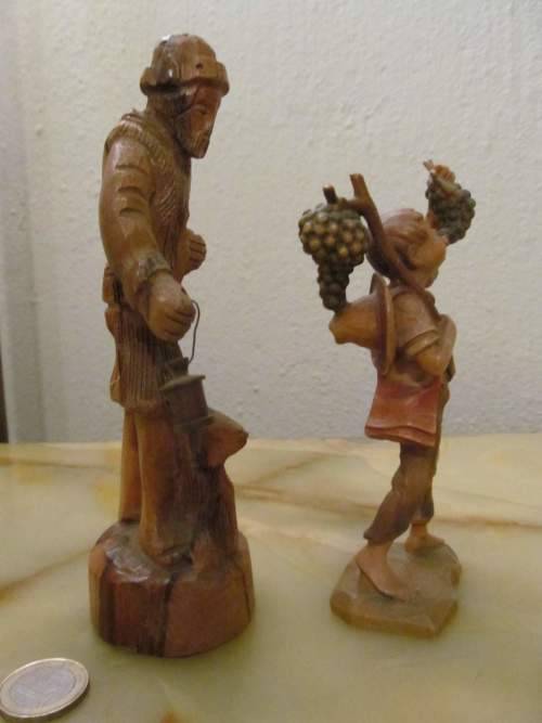 2)- A CARVED WOOD FIGURINE OF A YOUNG BOY HOLDING A LARGE BUNCH OF GRAPES UP TO HIS MOUTH AND WITH ANOTHER LARGE BUNCH HELD ON A STICK OVER HIS RIGHT SHOULDER. A HAT AND SATCHEL ARE ALSO DEPICTED. THE FIGURINE IS NOT MARKED OR STAMPED. IT IS IN PERFECT CONDITION WITH NO CRACKS, CHIPS OR DAMAGES ETC. 14.3cm HEIGHT.....5.5cm by 3.8cm BASE.....6.8cm LEFT TO RIGHT
