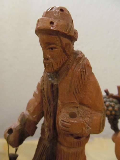 1)- A CARVED WOOD SHEPHERD DEPICTED WITH A LAMB STANDING AT HIS FEET. THE MAN HOLDS A CARVED WOOD LANTERN IN HIS RIGHT HAND WHICH IS SUMBOLIC OF HIM HAVING SEARCHED FOR AND FOUND THE LOST LAMB AT HIS FEET. ALTHOUGH THE ITEM SHOULD HOLD A WOOD STAFF IN HIS LEFT HAND, THE NATURAL HOLE BEING THERE.... THE STAFF IS LOST. THE ITEM IS NOT MARKED OR STAMPED BUT IS IN PERFECT CONDITION WITH NO CRACKS, CHIPS OR DAMAGES ETC. IT IS 17.5cm HEIGHT.....5.2cm DIAMETER OF BASE.....6.5cm LEFT TO RIGHT