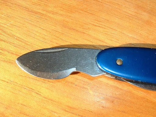 Close-up shot of the watch case opener blade on this Wenger watch case knife. The edge is sloped but dull along its edge. It is made to slide underneath the lip of a watch case back and pry it off.