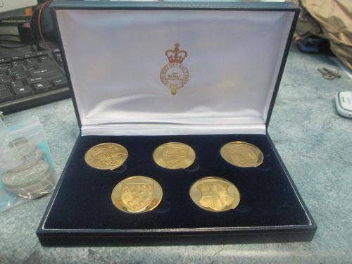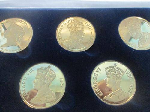 A Cased Collection of Royal Kings and Queens 22ct Gold Plated Tower Mint. A very nice example of a Cased Collection of Royal Kings and Queens of England. The set consists of five large medallions Queen Victoria, Edward VII, George V, Edward VIII, George VI, all finished in 22ct gold plated and all in their original case of issue, stunning detailing throughout each medallion two of which depicts St George & Dragon to reverse and all have a super highly polished gold finish, I have provided numerous photos for you to observe. They are housed in a Royal Blue velvet case, to the inside Royal blue velvet base and roof cream silk lining with gold lettering “The Royal Collection". Nice collectable set of British Royal memorabilia