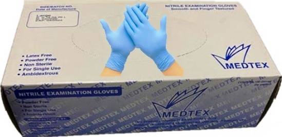 Product Overview The Casey Medtex Examination Blue Powder Free Medium Nitrile Disposable Gloves protects yours hands from undesirable materials , bacteria or Viruses, it will also not dry out your hands and Will not leave your hands with an unpleasant odour, This gloves are also Non slip even if they are wet. Nitrile gloves material is the way-of-the-future for all medical-grade/surgical gloves. The colour of these gloves are blue and size is large