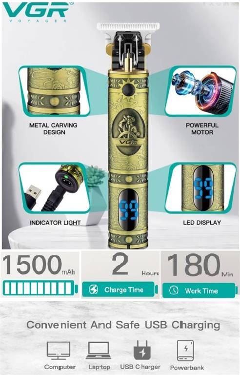 Casey VGR Professional Cordless Hair Clipper- LED Display , Ergonomic Design, Silver Carbon Steel T Shaped Blade Head, Automatic Grinding , Includes 3 Piece Detachable Guide Combs , Cleaning Brush , Lubricating Oil , Rechargeable 1500mAh Lithium Battery And USB Battery Charger Cable , Colour Gold, Retail Box 6 Months Warranty
