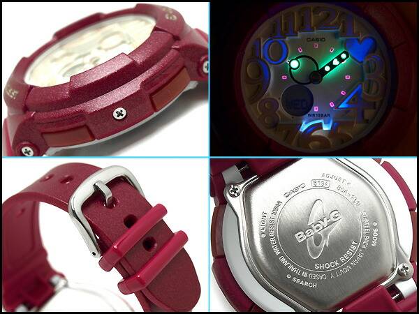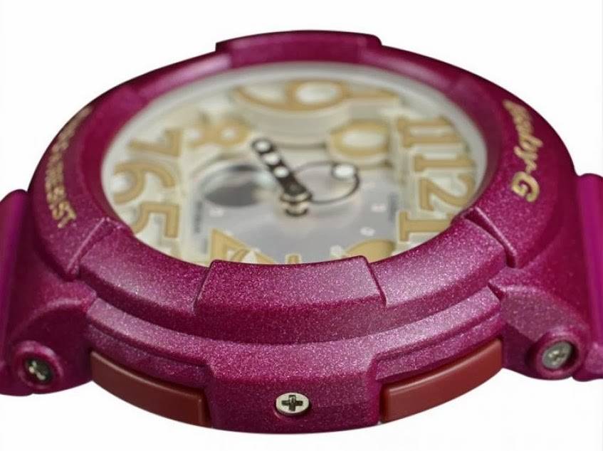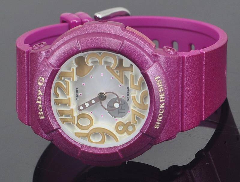 CASIO Baby G Metallic Analogue Ladies Wrist Watch The neon illuminator series, BGA-131, comes with layered face design to add a distinctive look of multi-dimentionality. Dark smokey metallic colors combine with large size faces of rough metallic colors for a look that is chic and distinctive. Ana-digi watch with smokey burgundy resin band and white/beige face.