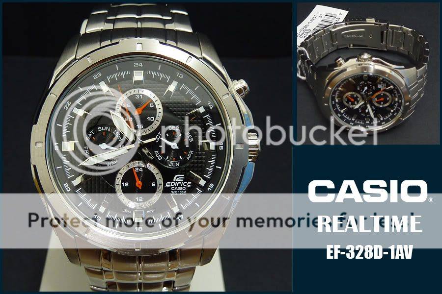 Four dials show day, date, month and 12/24 hour times at a glance Popular Large Case 100 meter water resistance Face formed by layering one panel on another for a feeling of depth Stainless steel case and band Edifice logo stamped on the crown, back cover and clasp | |