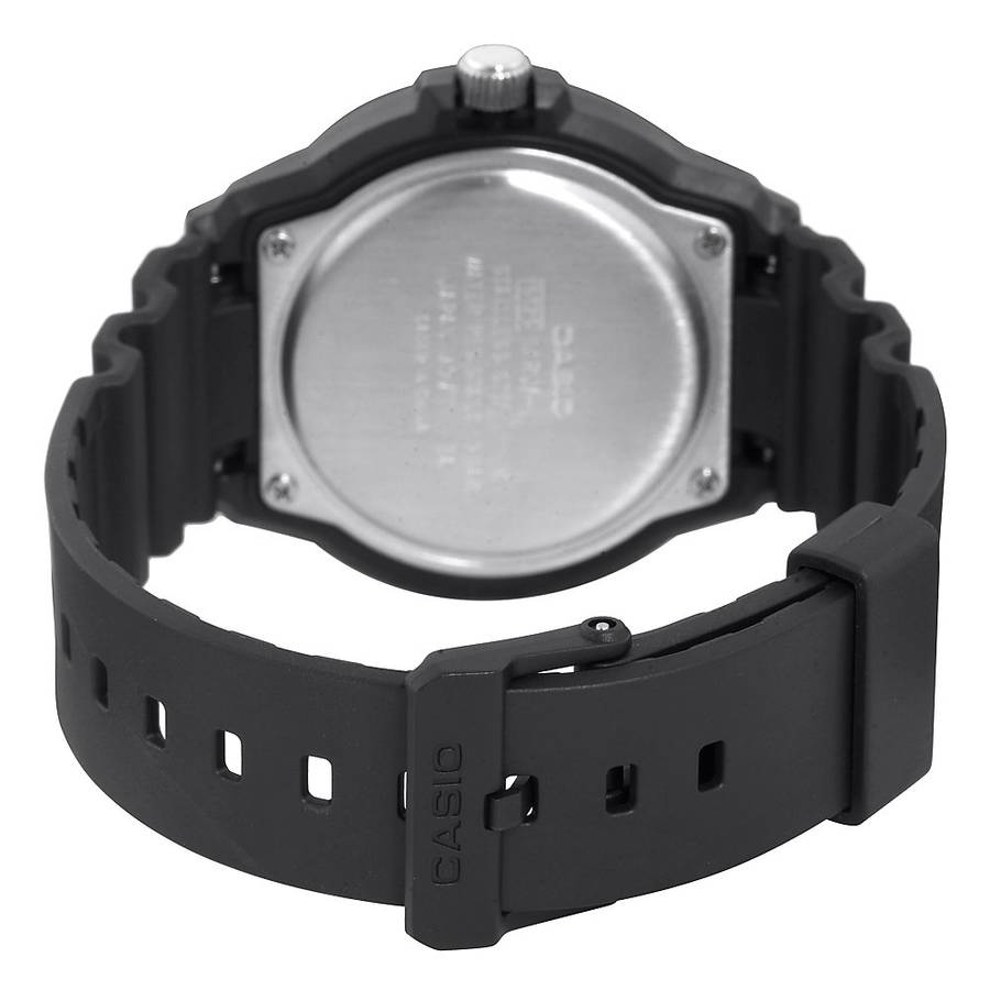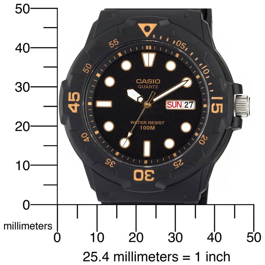 Brand Name: Casio Model number: MRW200H-1EV Part Number: MRW200H-1EV Item Shape: round Dial window material type: Mineral Display Type: analog Clasp: Buckle Case material: Resin Case diameter: 43 millimeters Case Thickness: 11.75 millimeters Band material: Resin Band length: mens-standard Band width: 22.5 millimeters Band Color: black Dial color: black Bezel material: Resin Bezel Function: unidirectional Calendar: day-and-date Movement: japanese-quartz Water resistant depth: 330 Feet