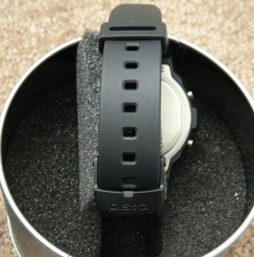 Resin/rubber strap with belt closing clip. stainless steel backing and night time lighting