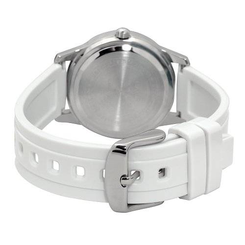 ladies standard analog with a large stainless steel case and 50-meter water resistance. These modes feature spherical mineral glass and a beautiful lamé-sprinkled bezel. White resin band analog watch with a white and pink face. 50M WR; 3 hand analog display; date display