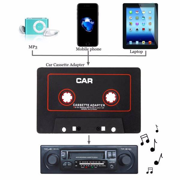 Feature: Pops right into your car's cassette deck to play music from your iPod or iPhone. Lightweight, portable design stores easily when not in use Improved cassette head mechanism for improved sound quality. Spring-loaded cassette head maintains solid contact with your cassette tape player's head for clear sound Dual Balanced conductors delivers more natural audio Car Audio Cassette Casette Tape 3.5mm AUX Audio Adapter MP3 MP4 CD iPod iPhone The 3.5mm to cassette adapter can be used with entertainment systems that have audio cassette tape decks, connect the 3.5mm stereo jack to the output source such as an mp3 player. Silent mechanism reduces mechanical noise on the road. Spring-loaded cassette head helps maintain contact with cassette player's head for clear sound. Now whether you are going down the block or cross-country, you will have plenty of music for the whole trip with this adapter. Connect your CD Player/MiniDisk Player/iPod to your car stereo through your car's in-dash cassette player. Cassette-shaped Interface inserts into your car's tape deck. Mini-plug inserts into your iPod/CD Player/MiniDisk Player headphone jack. Ideal for connecting MP3 Players and Phones to Car Stereos.