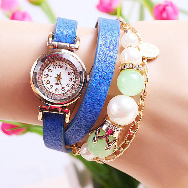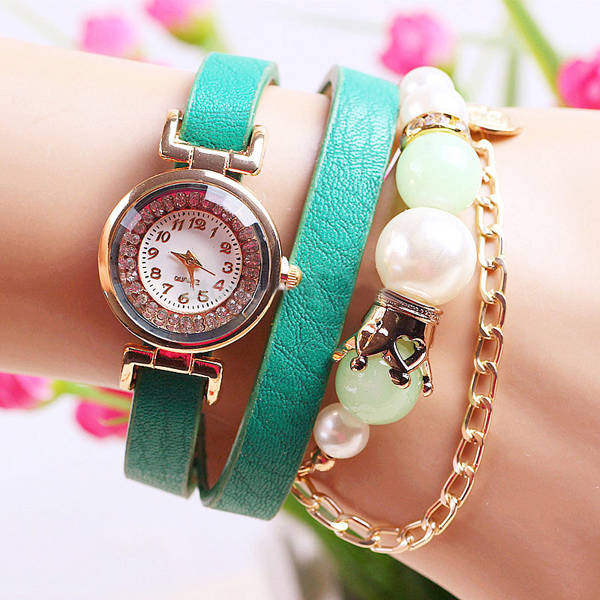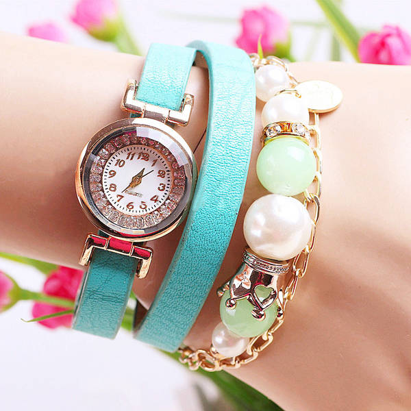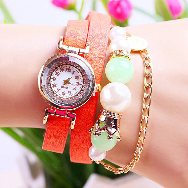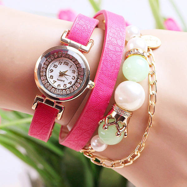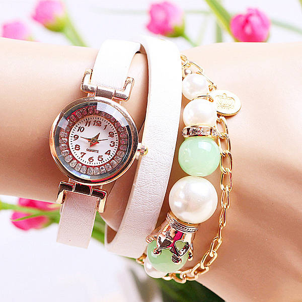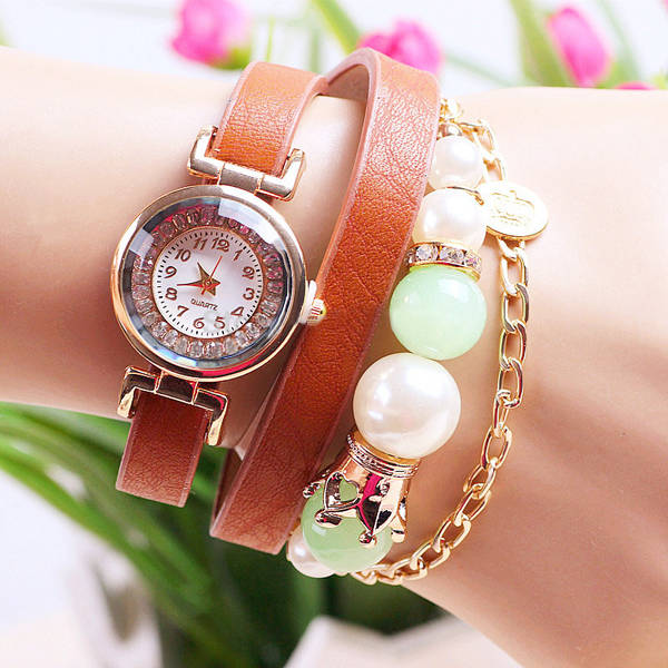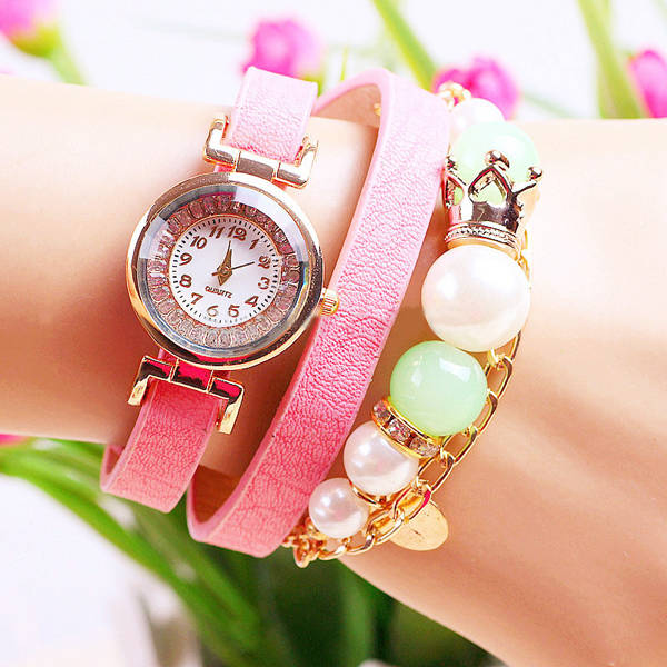 Casual Women Pearl Necklace PU Leather Band Bracelet Watch