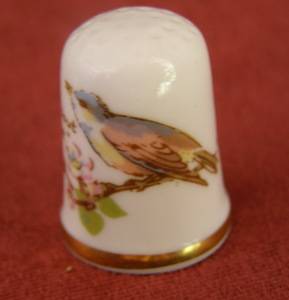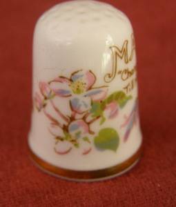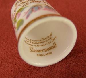 A Caverswall bone china thimble from the Country Diary of an Edwardian Lady series, depicting blossoms and a bird for the month of May. It is inscribed "Change not a clout, till May be out."