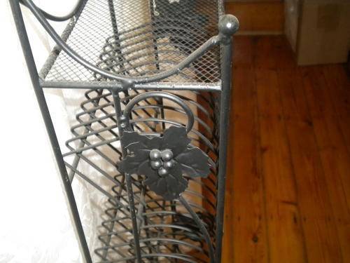 CD rack- it appears like cast iron but is light in weight. H=1000mm; W=230mm; D=120mm. Detail on sides grape leaves. 6 Shelves for 13 cd's each. Packing and shipping R35.
