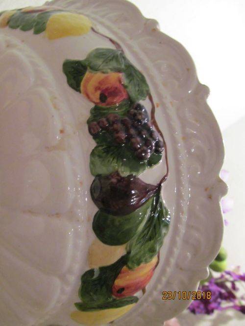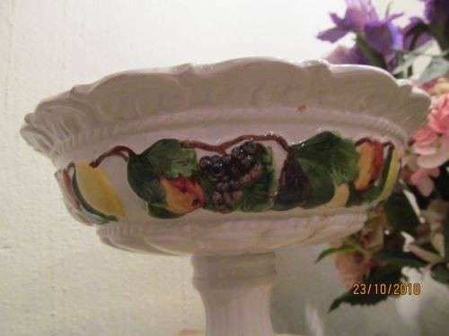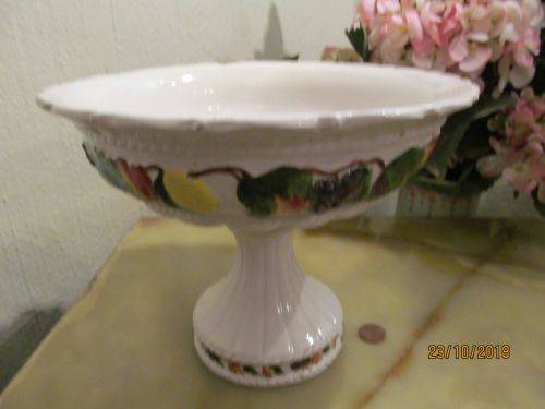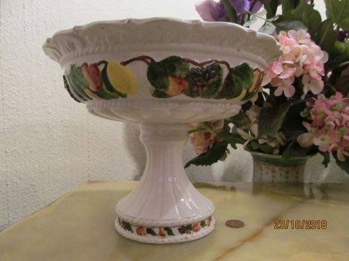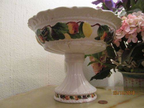VINTAGE WHITE CERAMIC PEDESTAL DISPLAY / COMPOTE / TAZZA CENTERPIECE WITH MAJOLICA STYLE FRUIT MOTIF