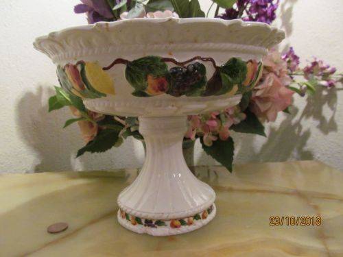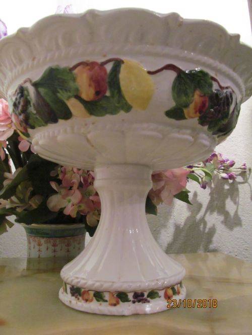 A LARGE VINTAGE CERAMIC TAZZA/COMPOTE/PEDESTAL DISPLAY DESIGNED IN THE IDEAL CENTERPIECE FUNCTION. THE ITEM IS MANUFACTURED FROM CERAMICS AND GLAZED OVER WHITE WITH A FLUTED DESIGN UPON THE PEDESTAL AND A ROPE MOTIF IN RAISED DETAIL DECORATING THE BASE AS WELL AS THE BOWL ITSELF. COLORFUL FRUIT IN RAISED MAJOLICA STYLE HAS BEEN CRAFTED AROUND THE SIDES OF THE BOWL BENEATH ITS GORGEOUSLY SCALLOPED RIM.