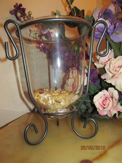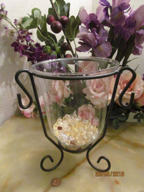 DECORATIVE IN A RUSTIC / COUNTRY MANNER BUT ADDING A UNIQUE DECO STYLE APPROACH TO THE SURROUNDINGS DUE TO THE MARVELOUS SCROLLED BLACK WROUGHT IRON OF THE STAND AND THE OVERALL APPEARANCE ADDED TO IT BY THE HAND BLOWN TRANSPARENT GLASS DISPLAY BOWL. THE BOWL IS CRAFTED IN THE FORM OF A BELL HUNG REVERSE SIDE UP WHEN PLACED WITHIN THE PERFECTLY FITTING STAND.
