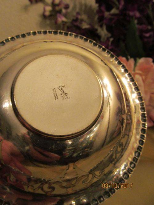 MANUFACTURED IN ENGLAND BY CAROLINE PLATE WITH A REPOUSSE CRAFT BALL MOTIF ON THE EXTENDED RIM AND A PIERCED METAL SCROLL PATTERN SET BETWEEN THE RIM AND A FLORAL SHAPED CENTER, THIS SILVER PLATED VINTAGE SWEETS / BON BON DISH IS ALSO AN IDEAL ORNAMENTAL ITEM