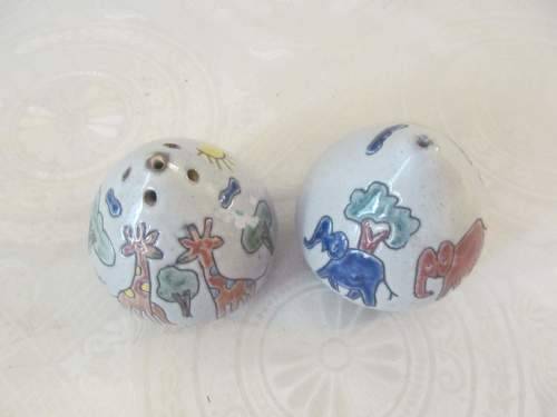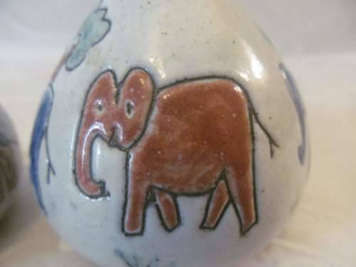 WITH EACH SHAKER BEAUTIFULLY HAND MODELLED AND THEN DECORATED IN COLORS WHICH CREATE AN ENAMELLED LOOK, BOTH THE SALT AND PEPPER SHAKER IN THIS LOT/SET HAVE BEEN DESIGNED IN A TYPICAL SOUTH AFRICAN STYLE AND EACH HAS BEEN CRAFTED TO RESEMBLE ARDMORE POTTERY WHICH IN FACT THEY ARE NOT.