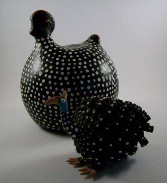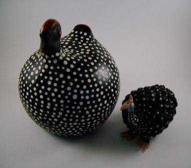 The Ceramic guinea fowl is 16cm high to the top of head and 41cm around the fattest section of body and about 14cm long. The unusual guinea fowl made from a pine cone is 7.5cm to the top of head and about 12cm long. They make a fine display.