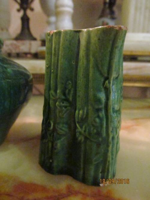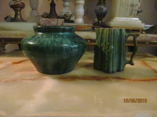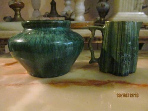 1- Glazed Green Container/Urn Painted to Look like the Semi Precious Stone Malachite - The Item is quite attractive with the overall effect being one of Shaded Green merging effortlessly into wisps of Lighter Toned jade. This item tends to create the impression that it is ancient Stone when in Fact it is ALL ceramic. PERFECT condition with NO chips, cracks or damages. 7.5cm height............ 6.7cm diameter at base............7.4cm diameter at rim..............11.5cm diameter at center
