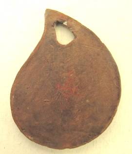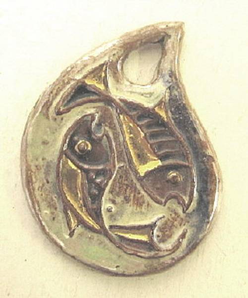 A ceramic pendant with a lustre glaze. The decoration depicts two fish and is thus presumably the astrological sign Pisces. Condition good except for a small chip on the underside that isn't visible when the item is worn as a pendant. Size: 62 x 47 x 3 mm.