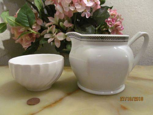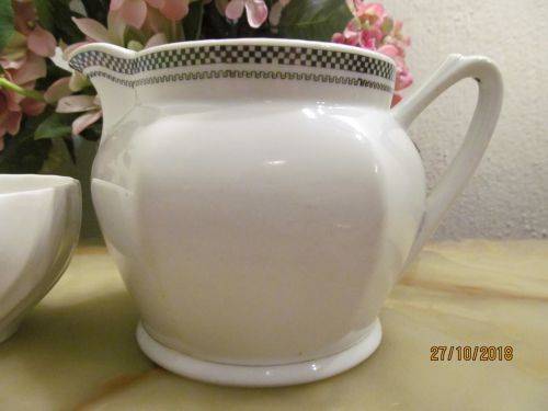 RANDOMLY PAIRED, A VINTAGE LOT WHICH CONSISTS OF A CERAMIC SUGAR BOWL DECORATED WITH A FLUTED SWIRL MOTIF ALONG THE SIDES AND A STOUTLY DESIGNED OFF-WHITE CERAMIC WATER / MILK PITCHER DECORATED WITH A BLACK CHECKERED PATTERN ALONG THE RIM WITH A MEANDERING MOTIF DIRECTLY BENEATH.