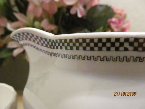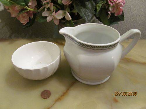 VINTAGE LOT OF CERAMIC WHITE FLUTED SWIRL MOTIF SUGAR BOWL AND OFF-WHITE CERAMIC WATER / MILK JUG WITH BLACK CHECKERED & MEANDER RIM PATTERN