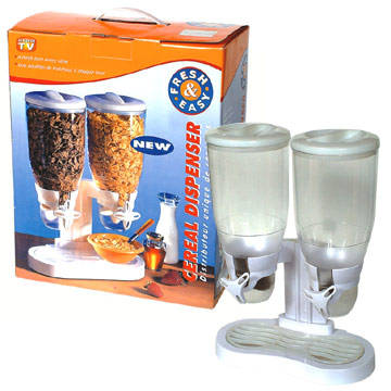 The double Cereal Dispenser preserves the freshness of dry food, prevents spills and waste and is suitable for all kinds of cereal, granola, rice, nuts, beans and even candy. Convenient for adults and great fun for kids. Just place bowl under dispenser, turn the knob and watch your favorite cereal fall neatly into your bowl without any fuss or mess in just the right amount you desire. Remove the bowl and enjoy your favorite cereal. On top of saving saving space and un-cluttering your kitchen, this nifty gadget will look great on any countertop. Easy to clean and dishwasher safe, you can't afford not to own this much talked about cereal dispenser