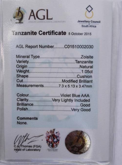 LAB CERTIFIED TANZANITE Gem Type: 100% REAL AAA Natural Tanzanite Shape: Cushion Cut Quantity: 1 Total Weight: 1.05ct Colour: Violet Blue Clarity: If Size: Size: 7.30x5.13x3.47mm Treatment: Heated Origin: Arusha - Tanzania Hardness: 7 MOH'S SCALE |