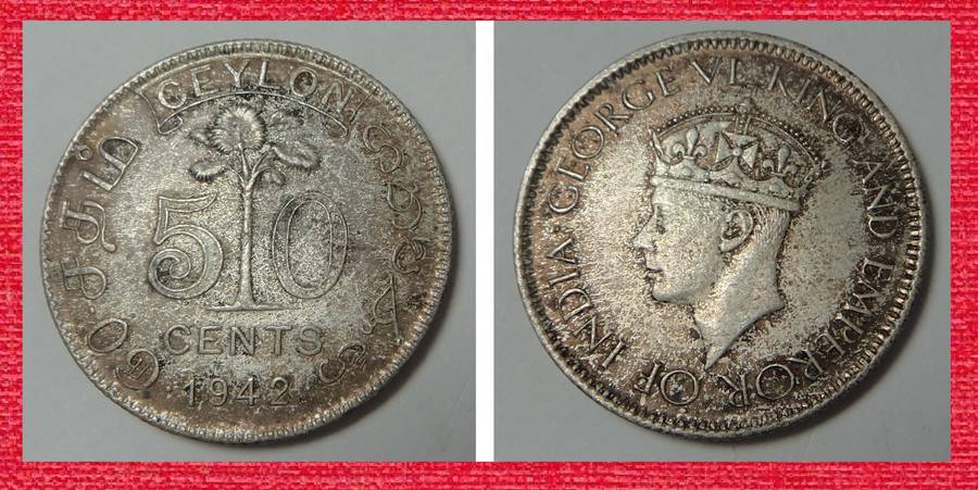 Ceylon, King George VI, Silver 50 Cents of 1942