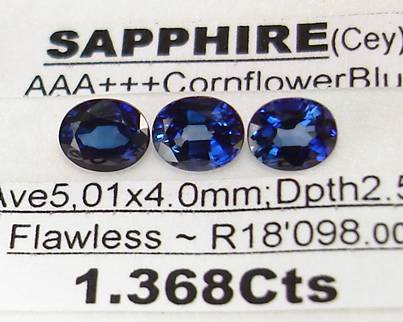Bid on one or two sets of 3 sapphires. One of the two identical sets can be seen in my photograph above. Each set contains 3 sapphires. Each set has a total carat weight of 1.368Cts.