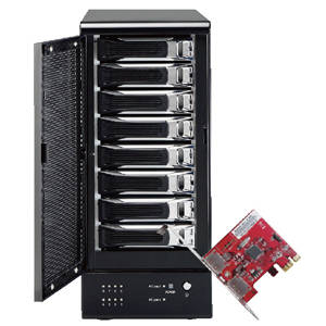 | This is 8 bay DAS (Direct Attached Storage) enclosure for high capacity storage needs. With build in ventilating protective screen front panel, the unit utilizes cable-less backplane design to support 8 hard drives. Hard drives are installed an easy access tray for simply insertion and removal. Hard drive cooling fan is located on the back of unit. It is a compact RAID tower use only one cable to access 8 SATA hard drives utilizing the SATA II port multiplier technology and also support RAID 0, 1, 5, 1+0 . | ||||||||||||||||||||