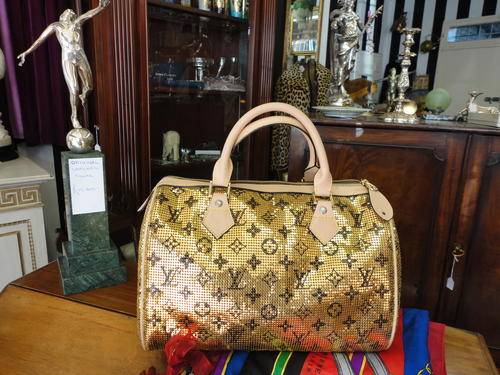 THIS IS A VERY UNUSUAL PIECE! FIRSTLY BECAUSE I HAVE NEVER SEEN LOUIS VUITTON IN CHAINMAIL - THIS IS A WHITINGS SPECIALITY. I DID'NT BUY IT NEW FROM A SHOP, I BOUGHT FROM SOMEONE IN LONDON BUT I BELIEVE IT HAS NEVER BEEN USED. STILL HAS DUST COVER, COLOURS ARE AS SEEN IN PICTURE, GOLD CHAINMAIL WITH DK BROWN LV LOGO AND LOUIS VUITTON EMBOSSED ON ALL FITTINGS WHICH ARE LEATHER. "ONE OF A KIND"