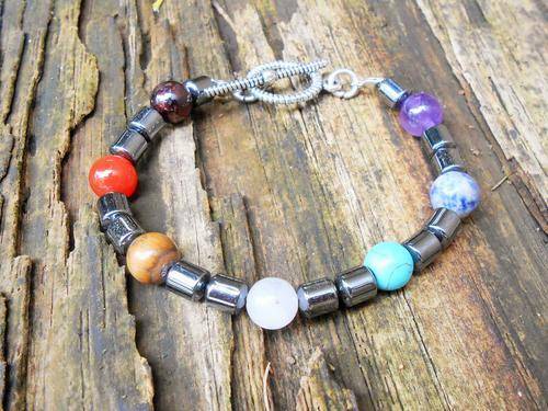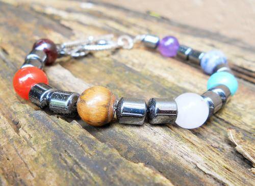 This bracelet contains stones that represent the 7 major Chakras, namely garnet, carnelian, tiger eye, rose quartz, turquoise, sodalite and amethyst.