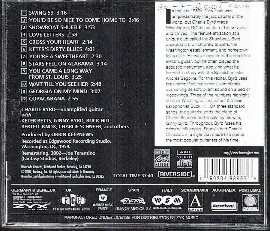 When Charlie Byrd recorded Byrd in the Wind in 1959, he was still two years away from discovering bossa nova. The guitarist had yet to interact with Astrud and João Gilberto or record anything by Antonio Carlos Jobim, and he had yet to become a major player in the Brazilian jazz field. Nonetheless, Byrd was an impressive jazzman even before he discovered bossa nova. Byrd (who sticks to the acoustic guitar on this album) already had a recognizably melodic sound -- one that underscored his appreciation of Django Reinhardt as well as Andrés Segovia and the Spanish school of classical guitar -- and he would have left behind a worthwhile catalog even if he had retired in 1960. The guitarist's classical leanings are hard to miss on Byrd in the Wind, especially when he employs woodwind players (all of them members of the National Symphony Orchestra) on some of the selections. His love of classical music is evident on "Stars Fell on Alabama" and other standards; it is equally evident on Byrd originals like "Swing 59" and "Showboat Shuffle." Although most of these 1959 recordings are instrumental, singer Ginny Byrd (the guitarist's wife) is featured on four tracks: "You'd Be So Nice to Come Home To," "You Came a Long Way From St. Louis," "Georgia on My Mind," and "Cross Your Heart." And her cool-toned performances show her to be a pleasant and capable (although not terribly original) vocalist with a strong Chris Connor/June Christy influence. Byrd in the Wind, which Fantasy reissued on CD in 2002 for its Original Jazz Classics (OJC) series, isn't among the guitarist's essential albums, but it's still a decent and pleasing document of his pre-bossa nova, pre-'60s period.