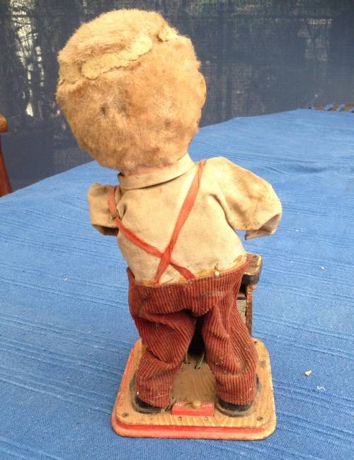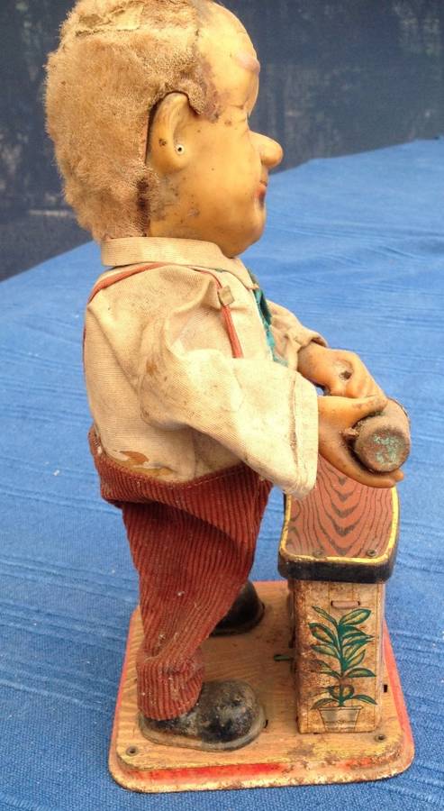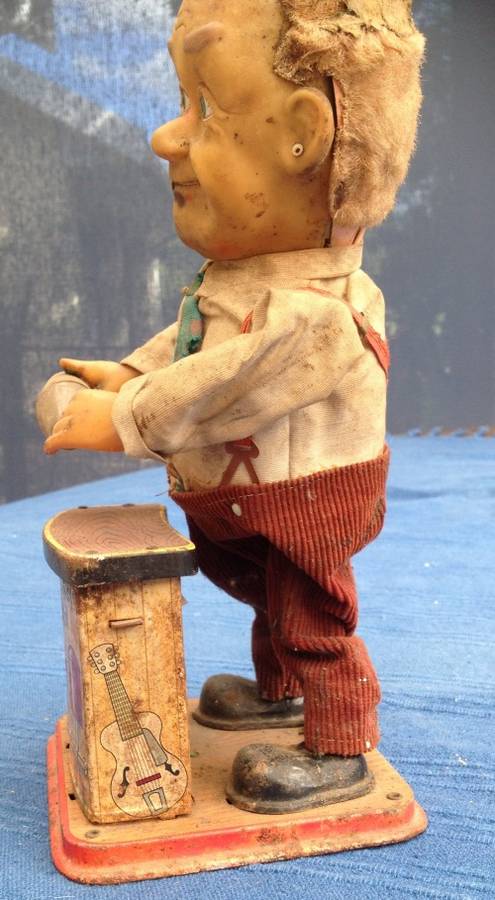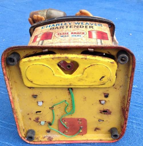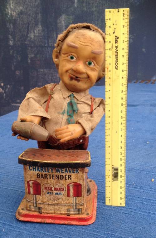 Vintage "Charlie Weaver" Bartender Toy. This Battery operated Tin Toy was produced in 1962 in Japan for Rosko Toys (Roy Rogers Enterprises). Originally the face turned red and smoke came out of his ears when the drink glass reaches his mouth. Charlie runs on 2 "D" cell batteries