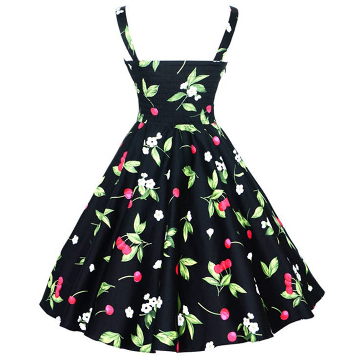 This charming black casual swing dress features:high-waisted and square neck design,wide shoulder strap,full circle skirt that falls in a fabulously voluminous A-line silhouette,cherry pattern looks so cute.