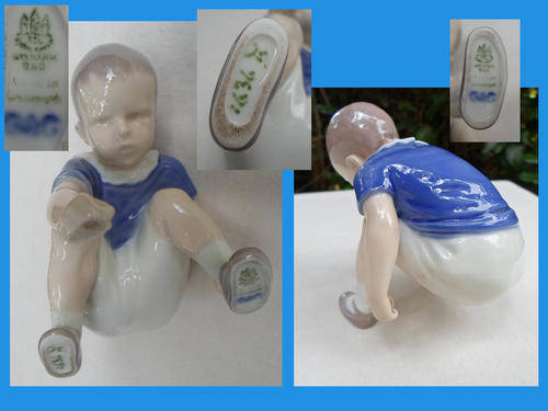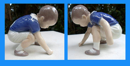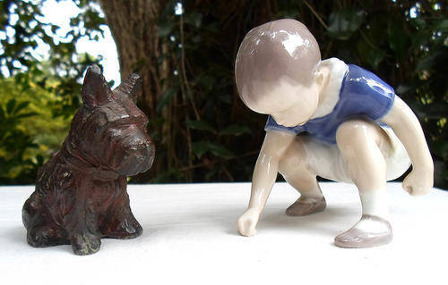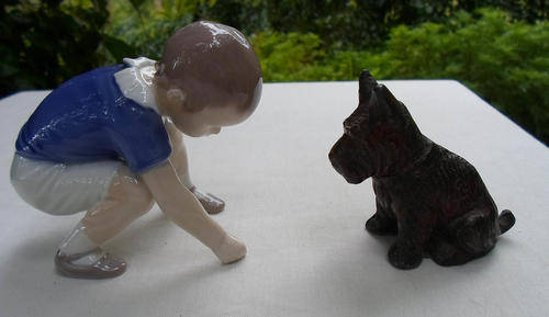 Charming Royal Copenhagen for Bing & Grondhal, porcelain figure, depicting a small boy bending with food in his hands for a goose. see example picture of the B & G goose figure. A metal dog included with this figure (no goose figure). Figurine is in excellent damage free condition, no repairs, no chips, no crazing. Figure measures approximately 10 cm L x 9 cm H x 7 cm W. Dog is about 7 cm high.