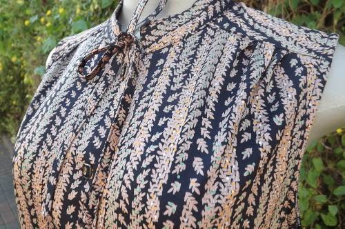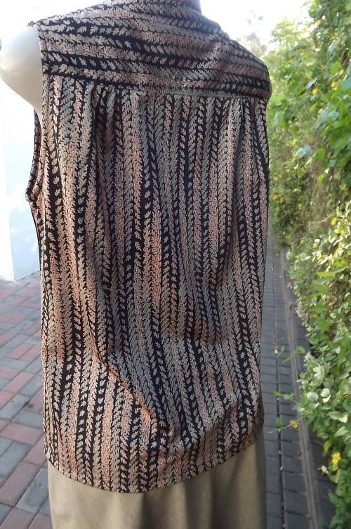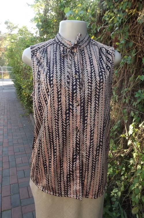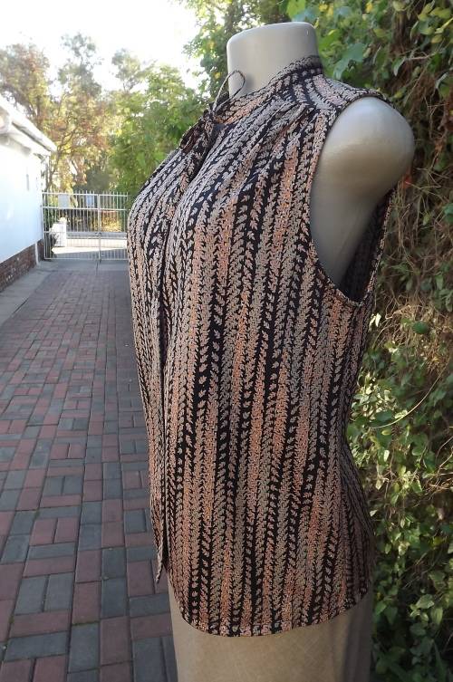Charming sleeveless top with high banded neckline with tiestring in front.Size 13/37.In black polyester with striped leaf pattern in beige.Gathered shoulder yoke.Made in Korea.New condition