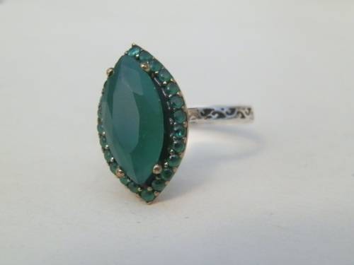 Pretty sterling silver emerald ring, marked 925 and in good condition. The size is P+ / 8+, top width 18 mm and the weight 2.7 g. The size of the large stone is 7 x 15 mm. Lovely!!