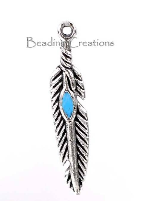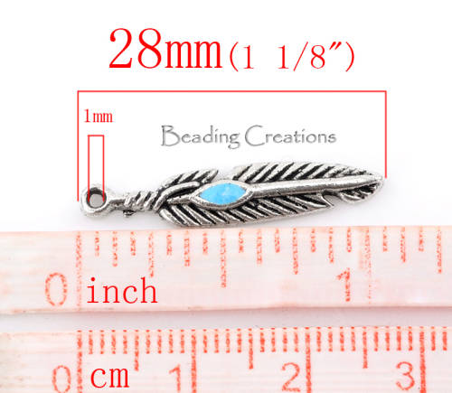 CHARMS - ANTIQUE SILVER - BLUE ENAMEL - FEATHER - CHARMS - 28x5mm