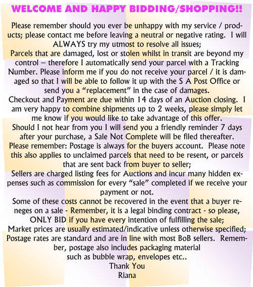 R65.00 Standard shipping applies to orders under R100.00, in most areas in South Africa. R35.00 Standard shipping applies to orders over R100.00. Some areas may attract a surcharge surcharge. This will be calculated at checkout if applicable.
