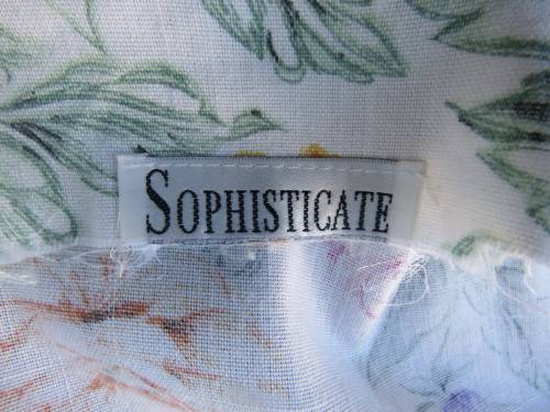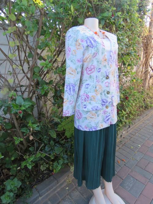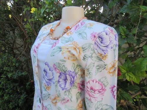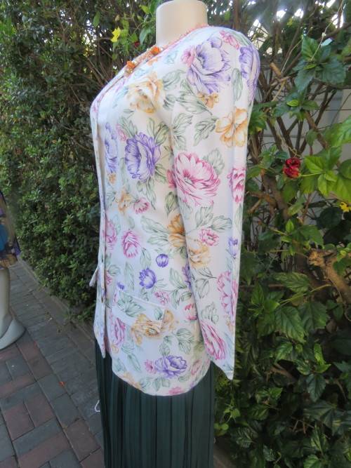 Cheerful floral long sleeve jacket in linen/cotton blend fabric.Size 34/10.By SOPHISTICATE.Low V with button down front.Light cream with pink,yellow and purple flowers.Two dummy pockets.Used but in good condition.