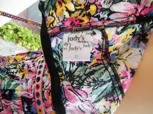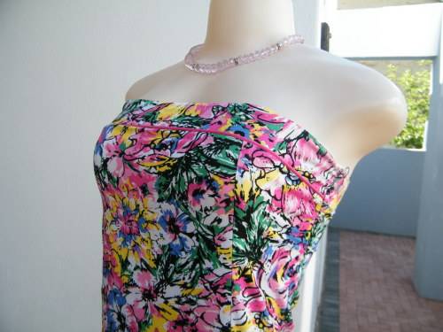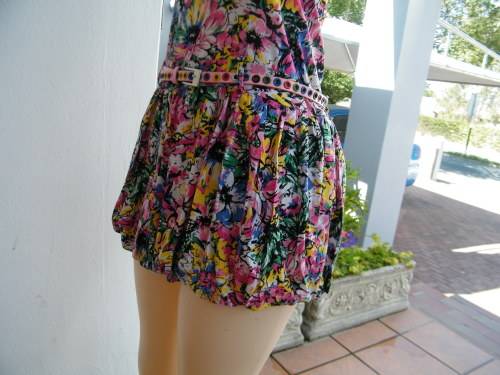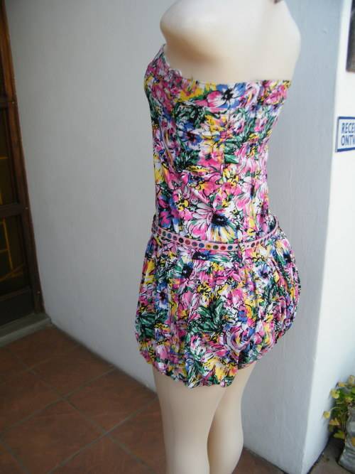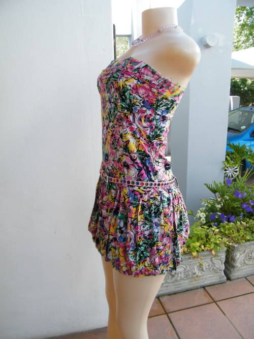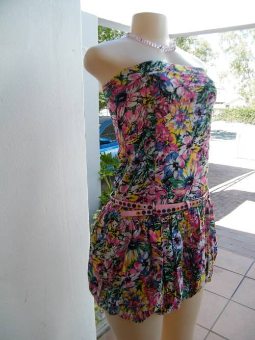 Cheerful floral mini dress in pink,yellow + blue.JUDY'S PRIDE size 30/6.Strapless with belt