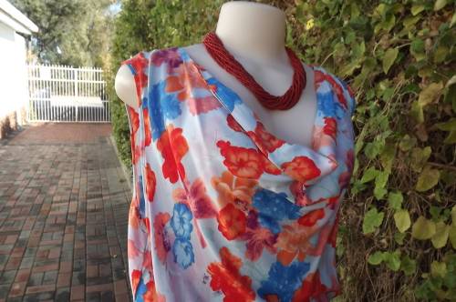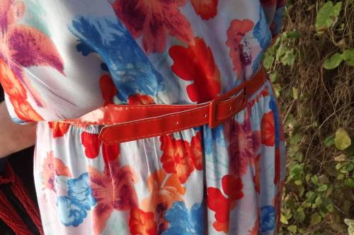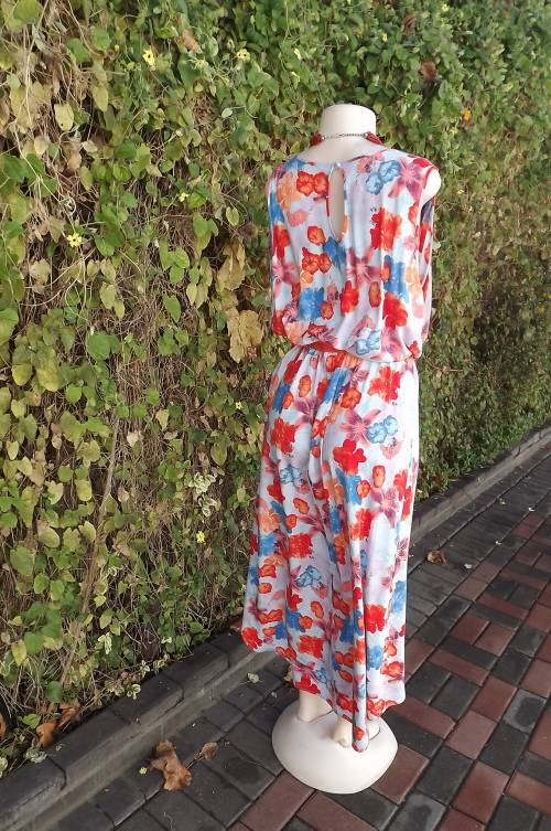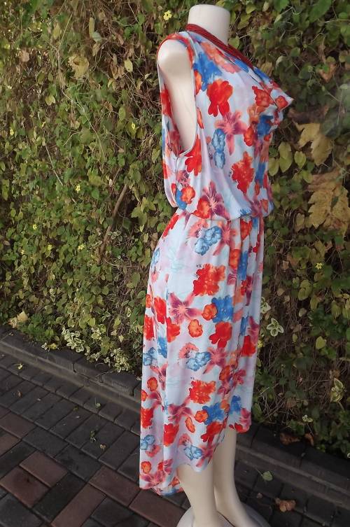 Cheerful floral summer dress in cool viscose.Blouson style top- elasticated.Size 40/16.Asymmetrical seam line with orange colour belt included.Used but good for everyday wear.