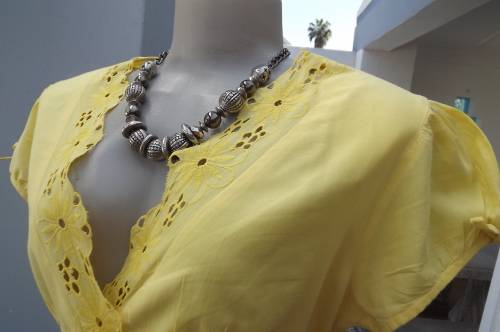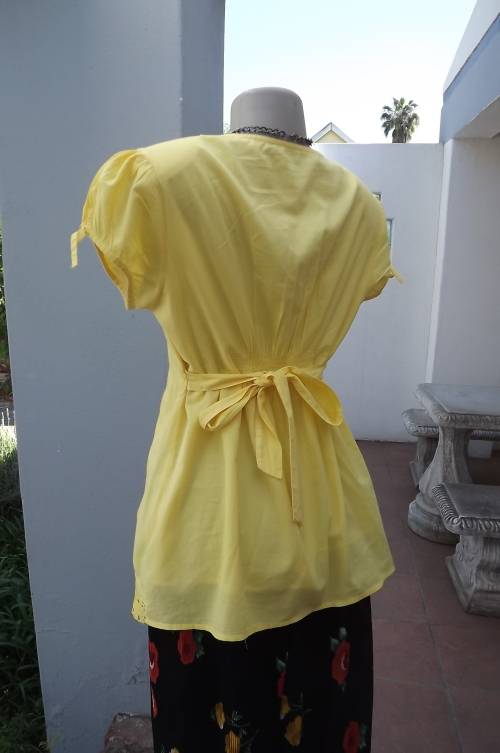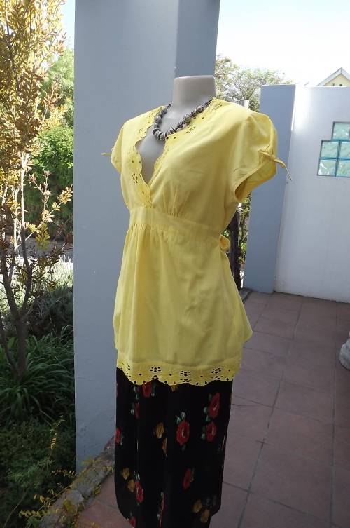 Cheerful yellow summer maternity top with capped sleeves.Size 36/12 by "DU DATE".Empire style with v decorated with lace cotton.Some elastic at middle back.As new. This is a time to shine!!