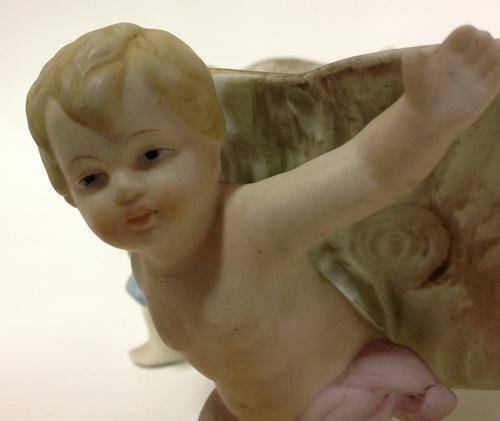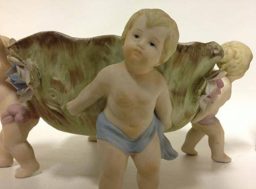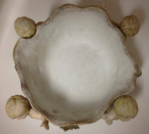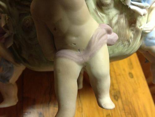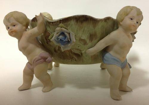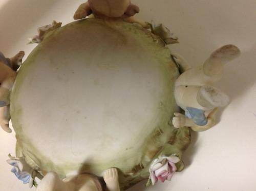 This bowl is too lovely for words! It is supported by 4 cherubs and the outside of the bowl is decorated with applied roses. With cherubs, the bowl measures 24x23cm and stands 12cm tall. In good condition but I notice the one leg of one cherub has been repaired at the top of the leg, leaving a narrow crack line. The bowl stands sturdy though and this damage is only noticeable close up, turn this angel towards the back and nobody would be wiser to the small damage. I notice a line on the underside of the bowl that can be mistaken for a crack, which it is not, this was done at time of manufacture.