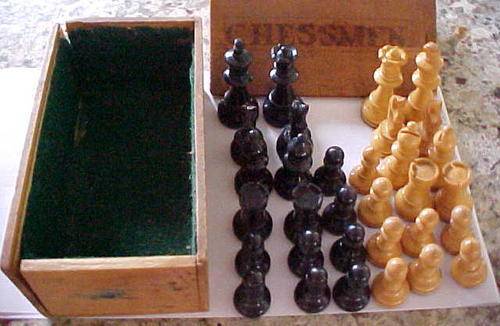 CHESS - VINTAGE WOODEN CHESS SET IN BOX BLACK & WHITE PIECES 4 CMS IN HEIGHT