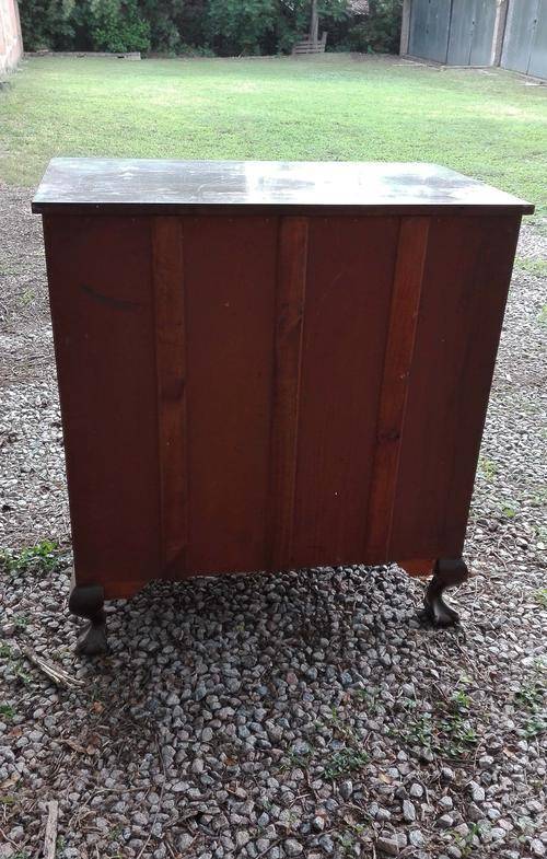 The chest has five drawers and is a good condition and perhaps needs to be sanded down as the top has some water marks. It is made of Imboya wood. Size is width 50cm, length 86.5cm, height 77cm. |